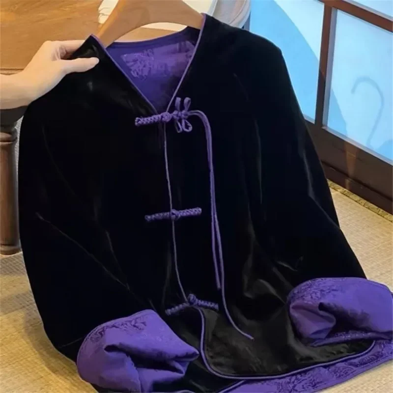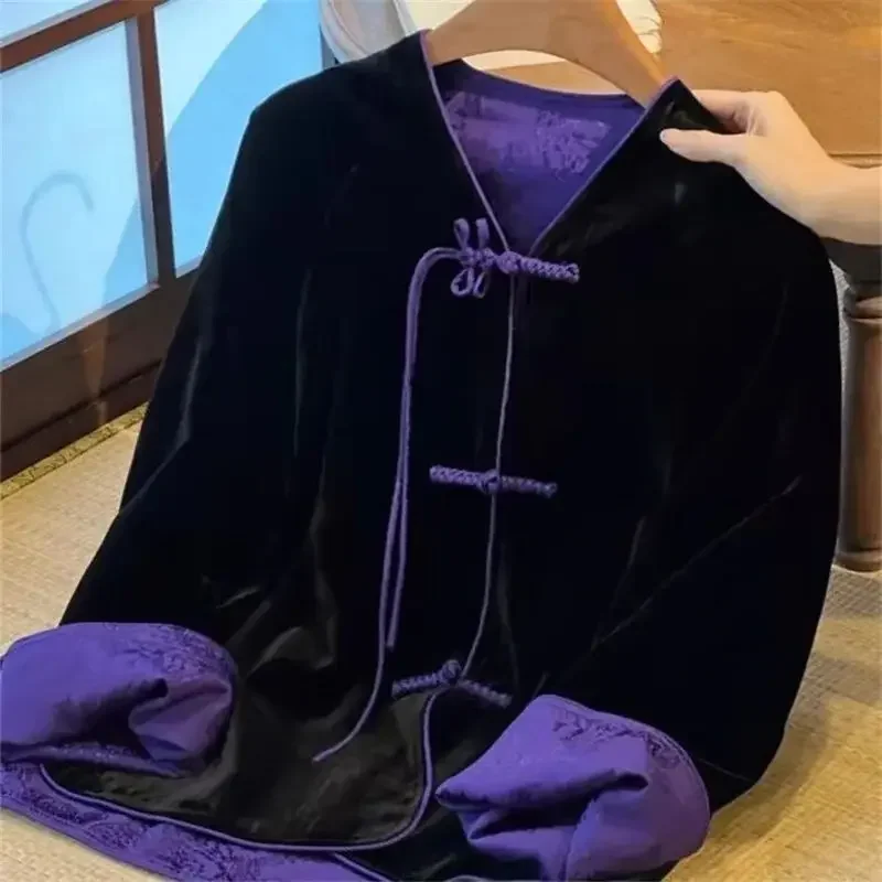 Black Velvet Jacket Women High-end Spliced Purple Coat Chinese Style Tassel Buckle Womens Outerwear Autumn Winter