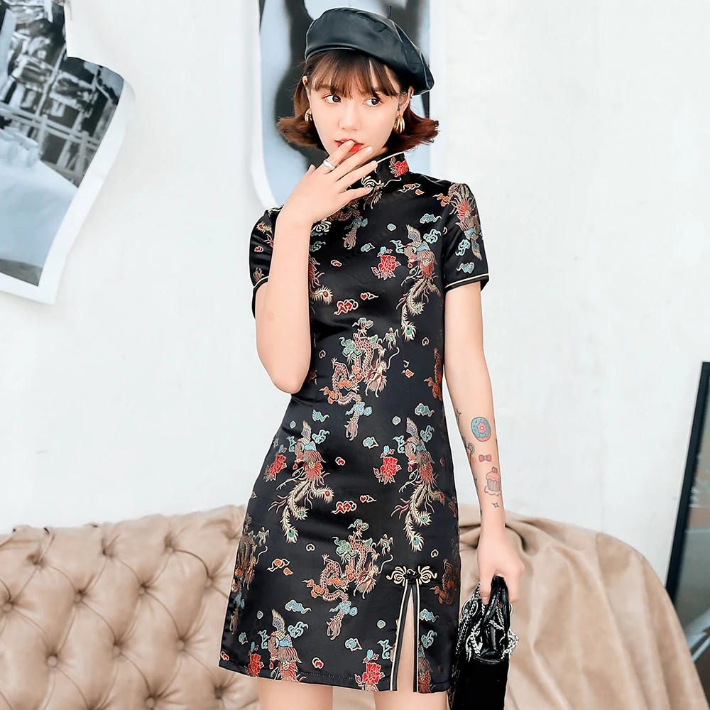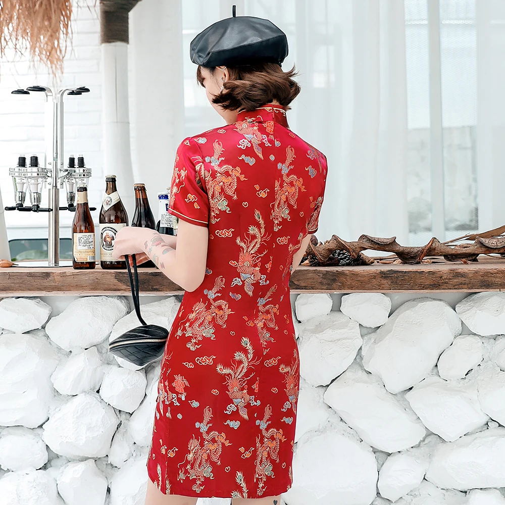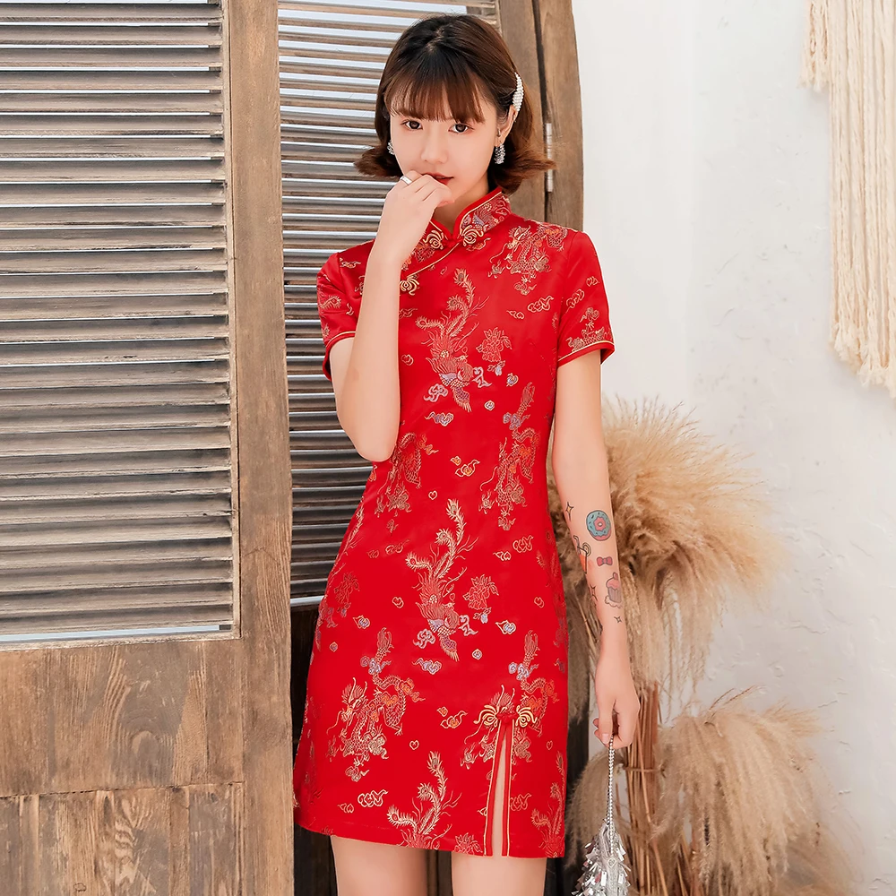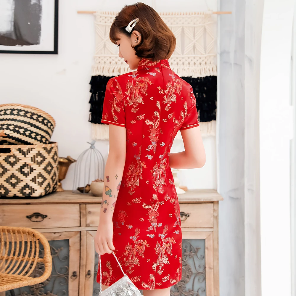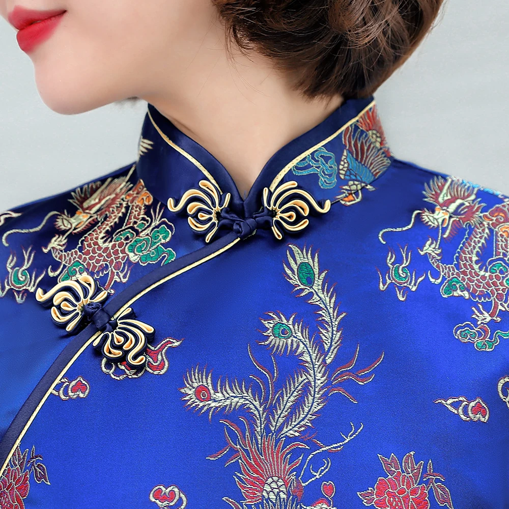 Female Qipao Mandarin Collar Short Cheongsam Vestidso Elegant Chinese Dress Gold Flower Novelty Satin Evening Party Gown