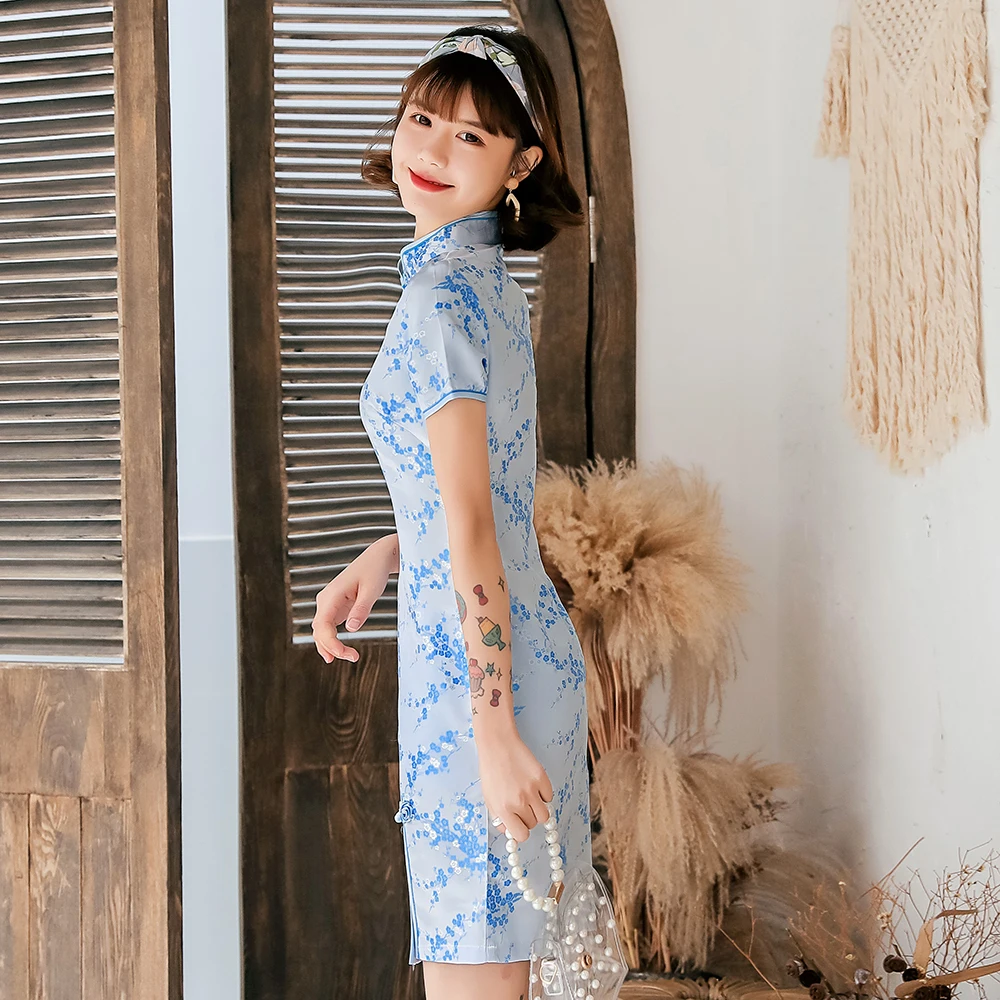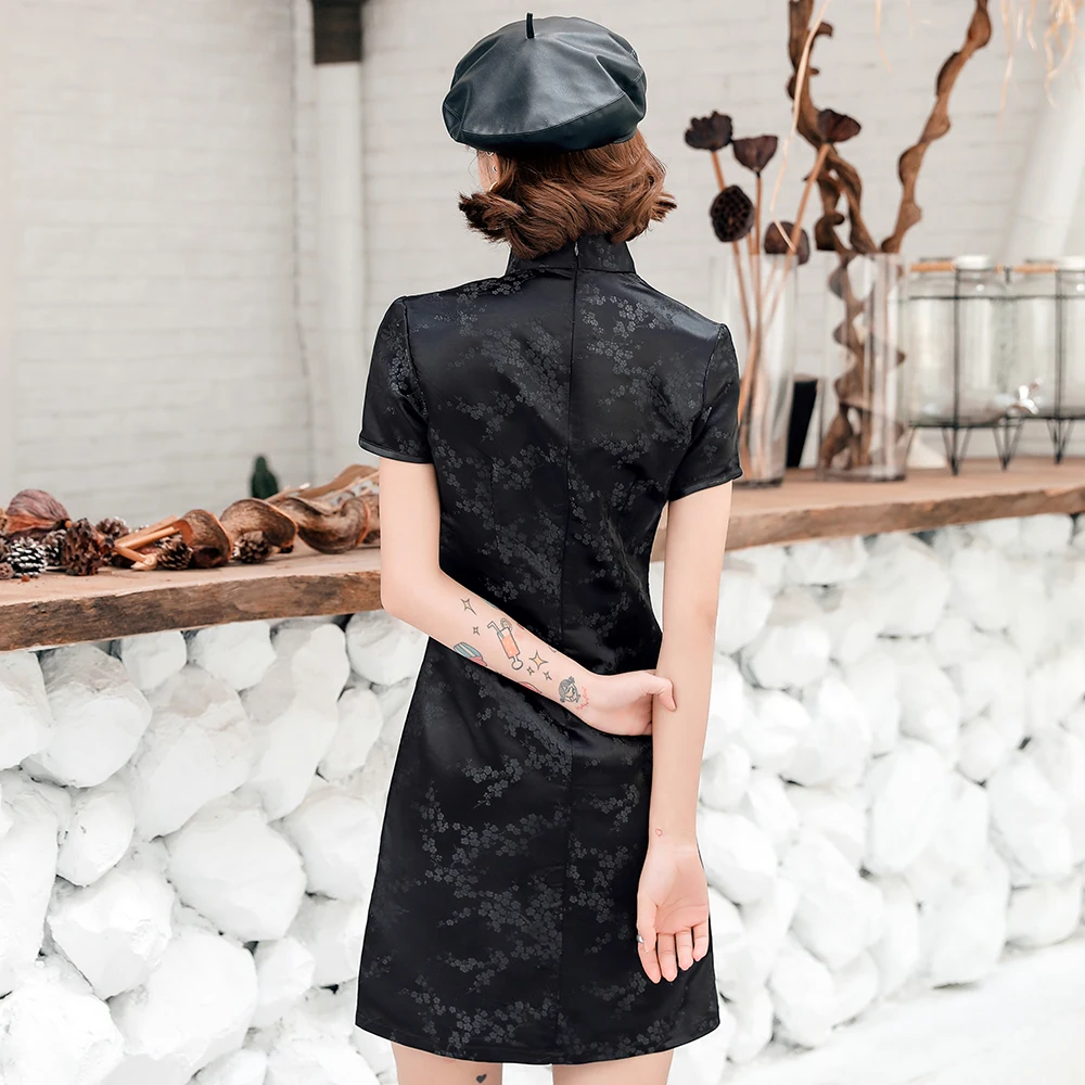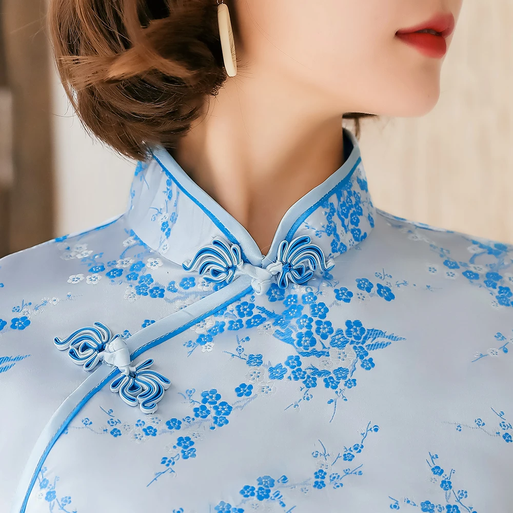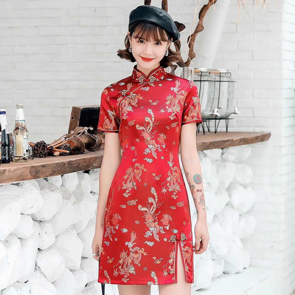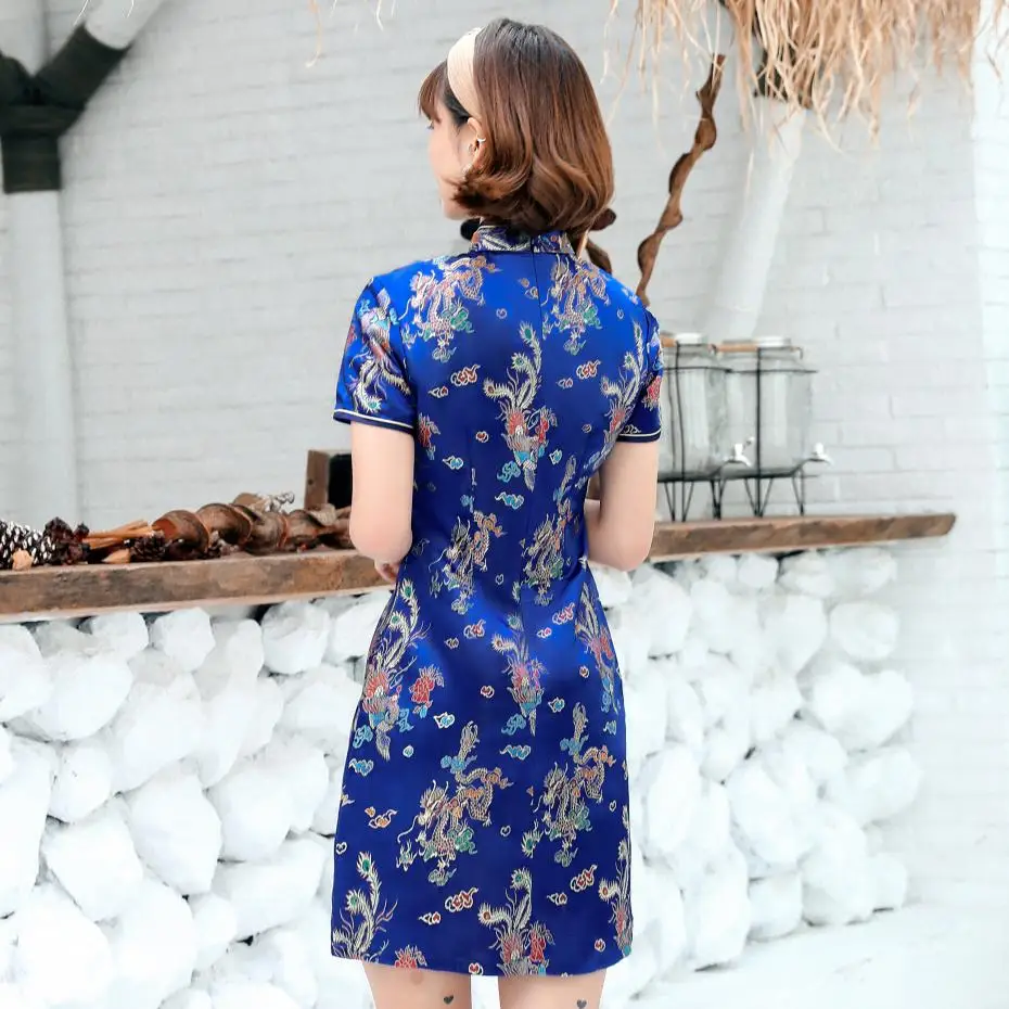 Female Qipao Mandarin Collar Short Cheongsam Vestidso Elegant Chinese Dress Gold Flower Novelty Satin Evening Party Gown