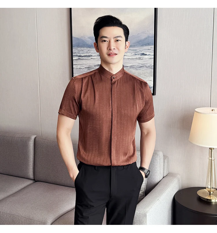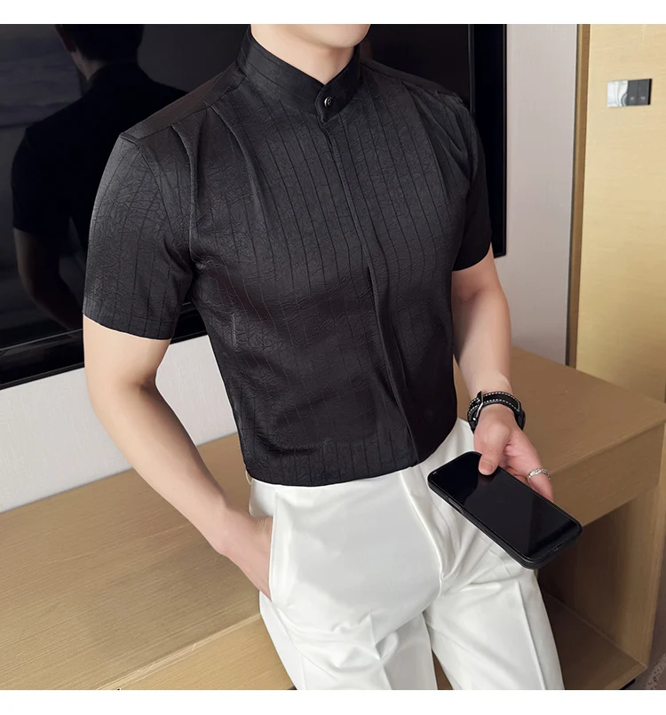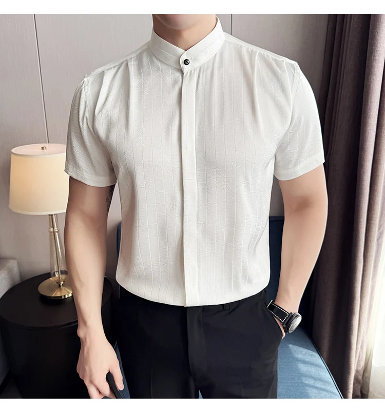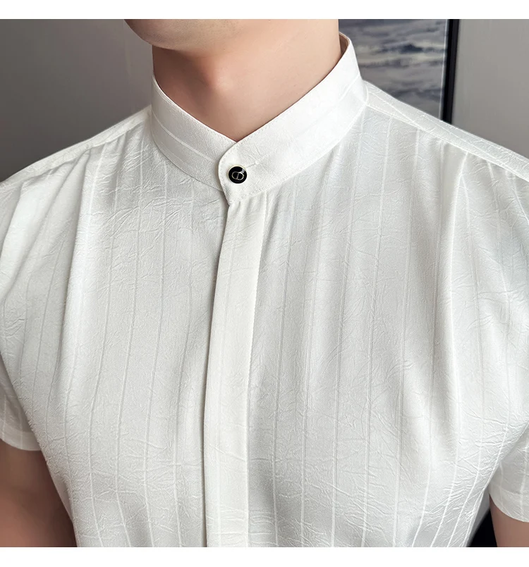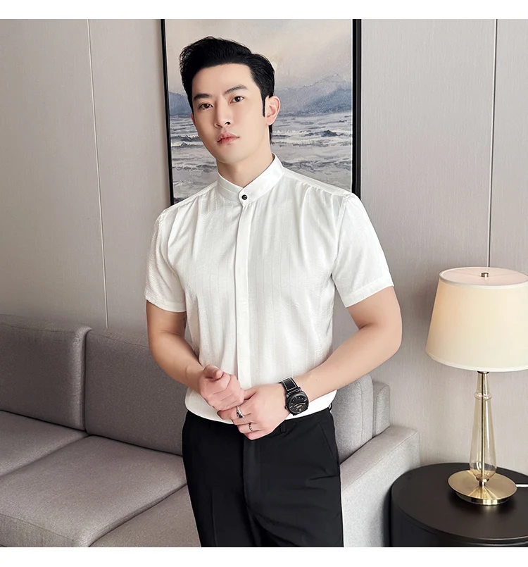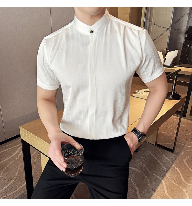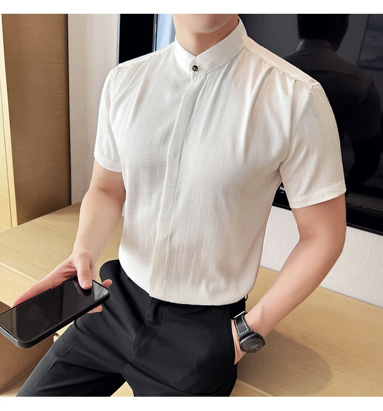 Men Modern Chinese-Inspired Mandarin Collar Short-Sleeve Shirt - Lightweight Striped Design with Slim Casual Semi-Formal Wear