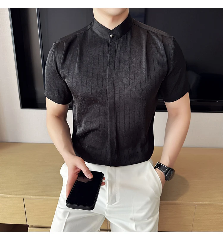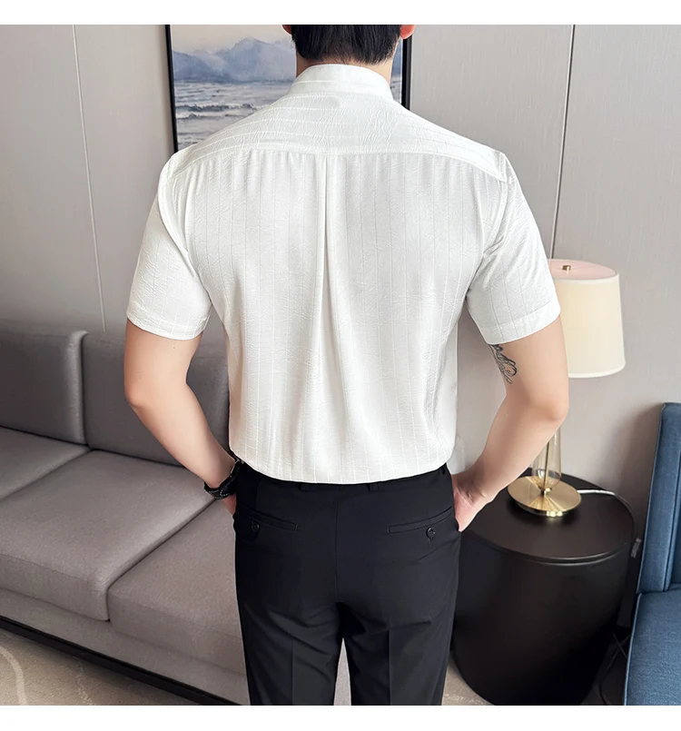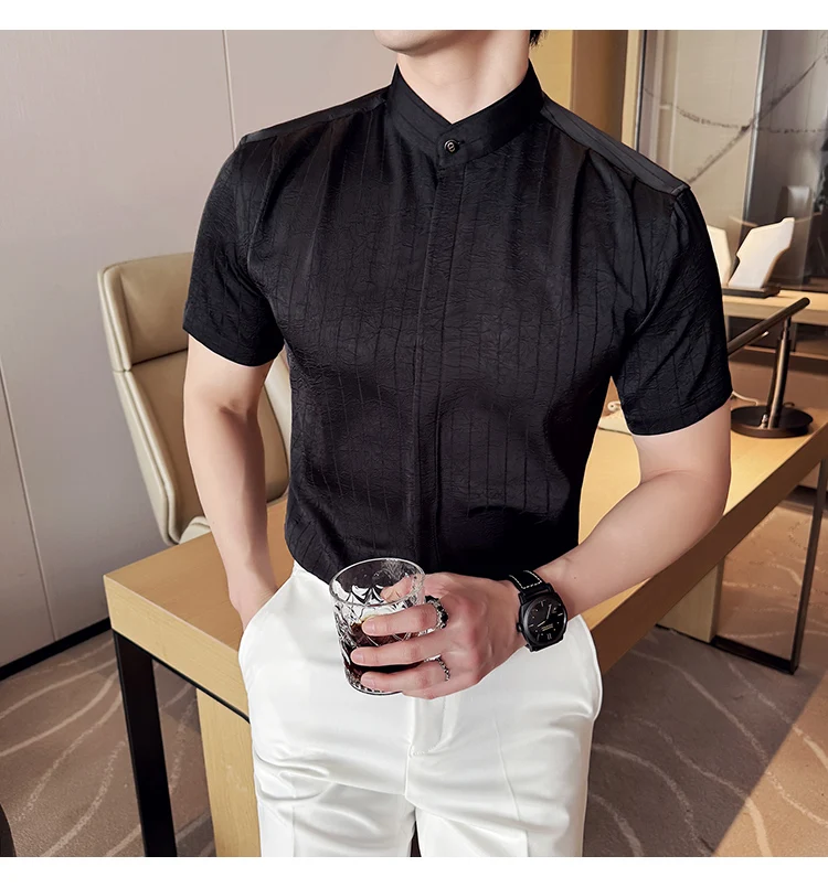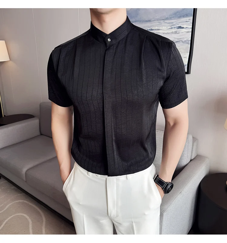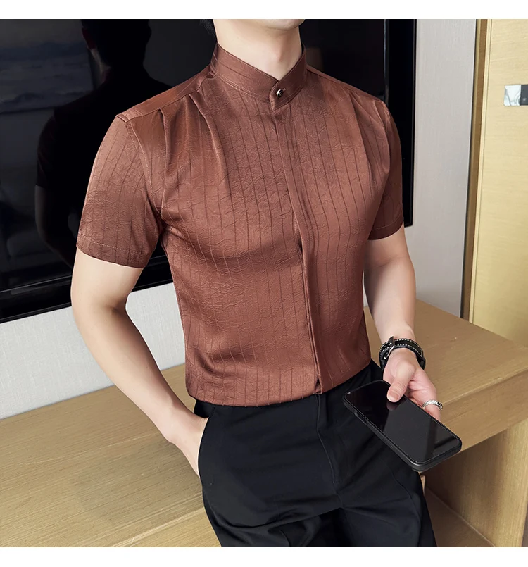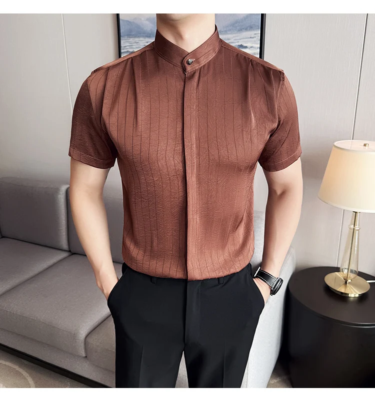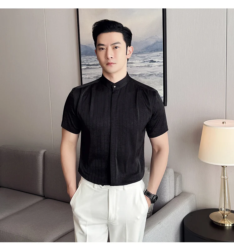 Men Modern Chinese-Inspired Mandarin Collar Short-Sleeve Shirt - Lightweight Striped Design with Slim Casual Semi-Formal Wear