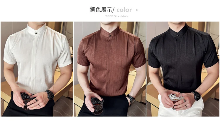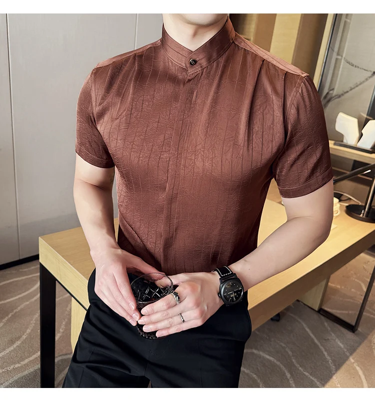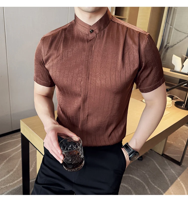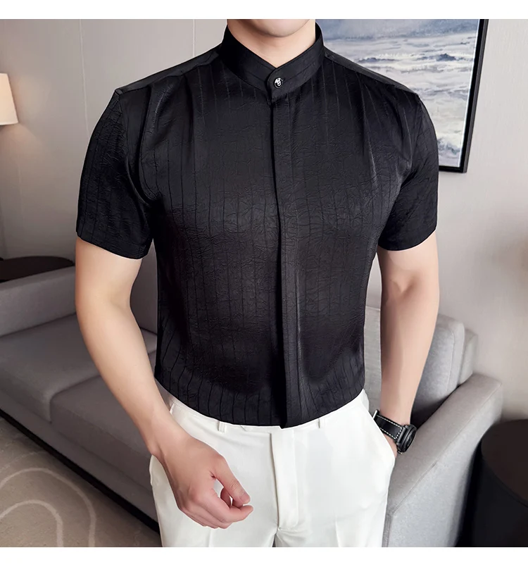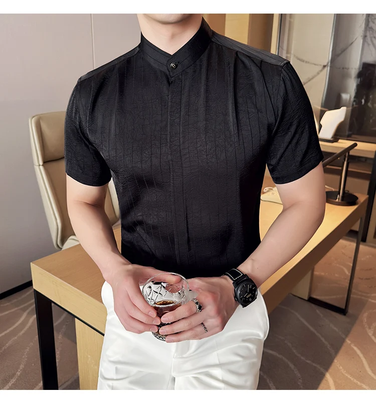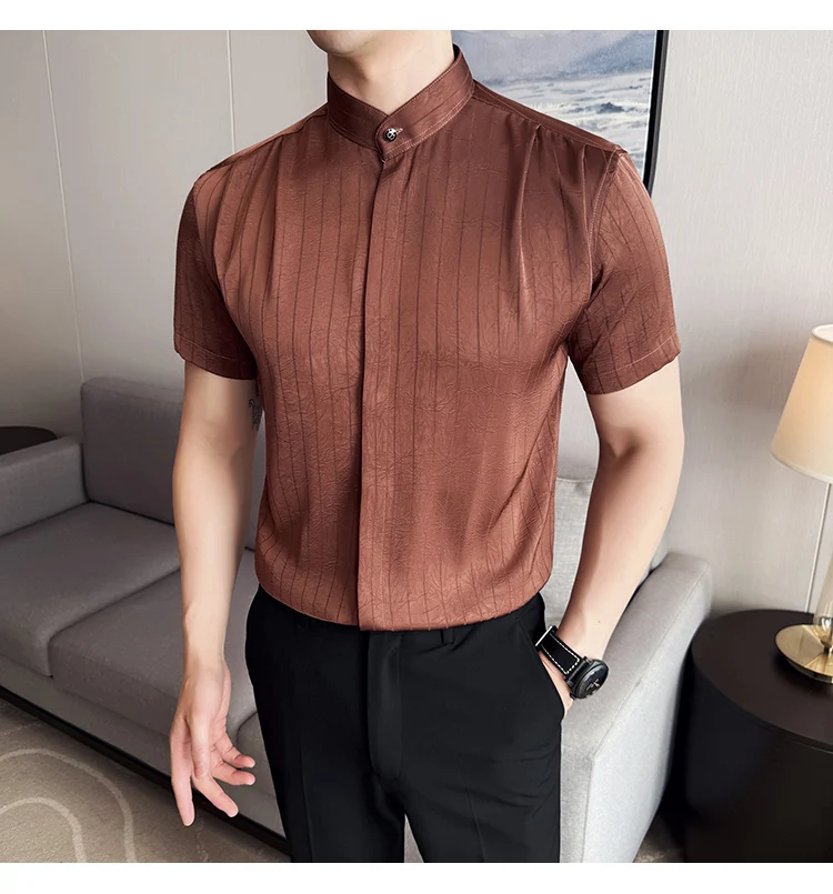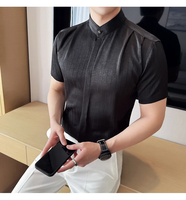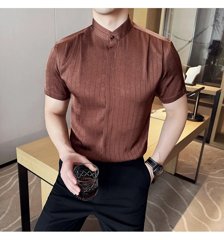 Men Modern Chinese-Inspired Mandarin Collar Short-Sleeve Shirt - Lightweight Striped Design with Slim Casual Semi-Formal Wear