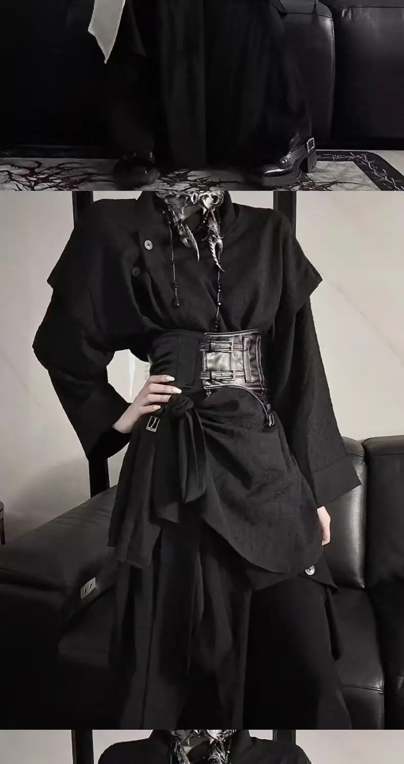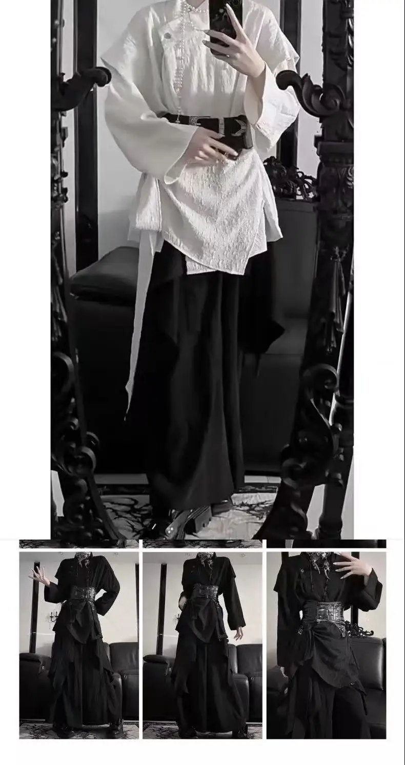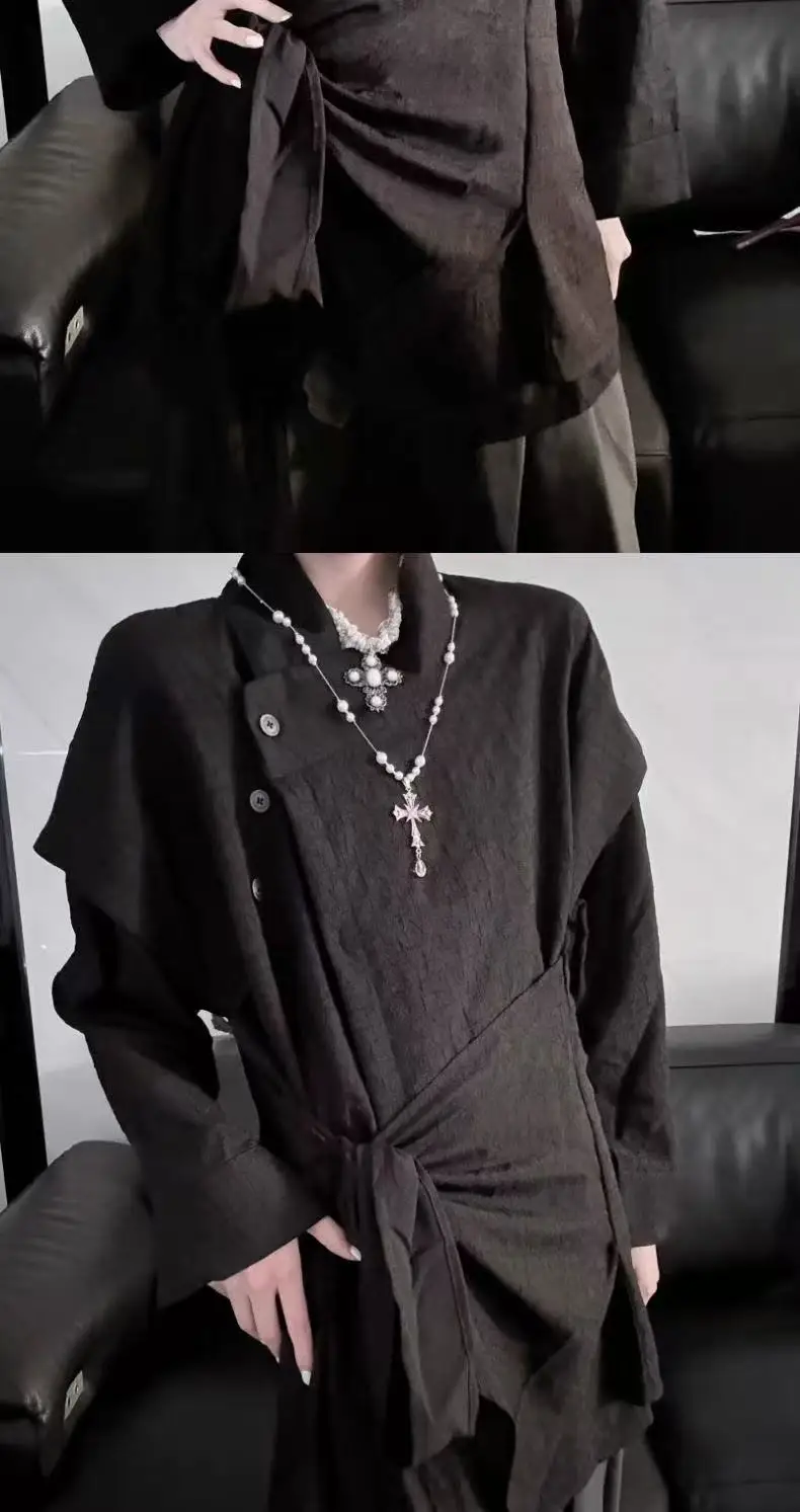 Niche Dark Black Costume New Chinese Style Long Sleeved Slanted Strap Top Shirt Vintage Bisex y2k Fashion Outfits Trendy Cool